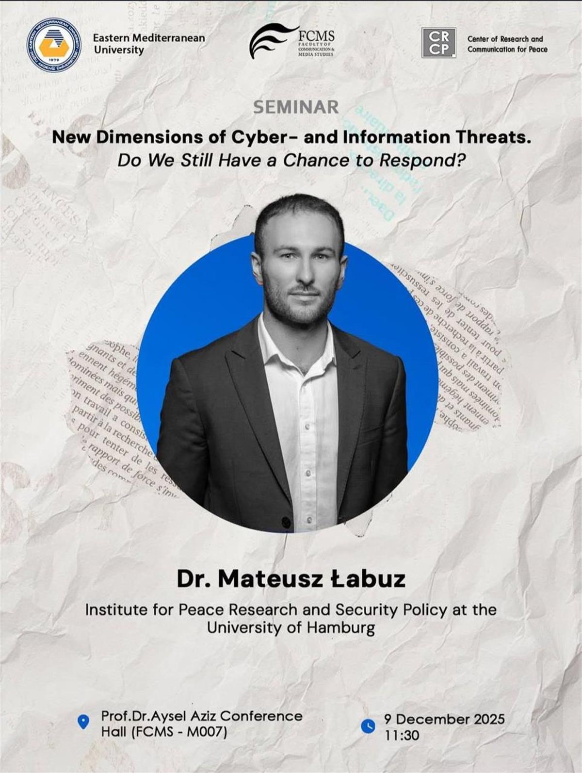 Eastern Mediterranean University Faculty of Communication hosted a compelling seminar titled “New Dimensions of Cyber- and Information Threats: Do We Still Have a Chance to Respond?”, organised with the contributions of the Center for Research and Communication for Peace (CRCP). Moderated by Assist. Prof. Dr. Huri Yontucu, the event brought together students and academics to explore how hybrid and cognitive threats are reshaping the contemporary information environment.